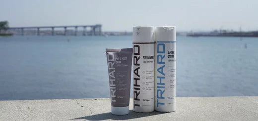 - Before you swim, use a pre and post-swim body lotion like Trihard’s to create a protective barrier around your skin that neutralizes chlorine absorption.